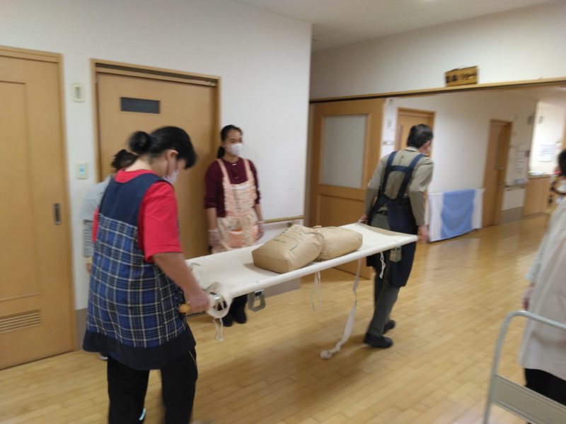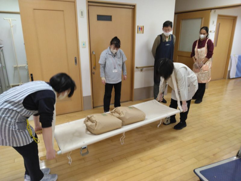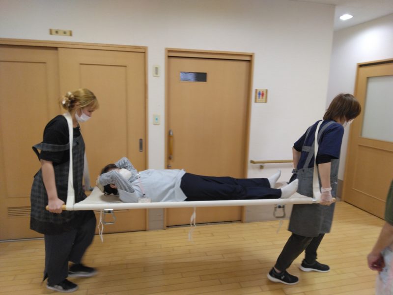 2Fの利用者様を3階にお連れするのに必要な担架の練習も行いました。